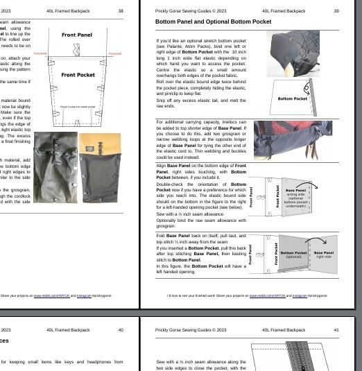 *Although a frameless backpack guide, the instructions include an optional sleeve that allows you to insert a shaped bit of plastic/foam as a frame for a slight improvement in carrying comfort. There are no load lifters, padded hip belt or frame instructions, as these are covered in the range of Prickly Gorse Framed Backpack sewing guides.